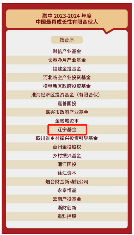 2024年是遼寧全面振興三年行動計劃的攻堅之年。今年以來,金控集團全面貫徹落實省委省政府工作要求,在省財政廳的業(yè)務(wù)指導和有關(guān)行業(yè)主管部門的關(guān)心支持下,堅持健康、規(guī)范、市場化的原則,積極有序運營管理遼寧產(chǎn)業(yè)投資基金,扎實推進基金落地和項目投資工作,取得了一定進展,也獲得了行業(yè)內(nèi)專業(yè)機構(gòu)的認可和好評。遼寧基金繼2022年入選投中“中國最佳新銳有限合伙人TOP10”、母基金研究中心“最佳政府引導基金(省級)TOP30”,2023年入選LP投顧“年度最佳省級政府引導基金TOP30”、LP CLUB“私募股權(quán)年度明星產(chǎn)業(yè)LP機構(gòu)TOP10”榜單后,今年又再次入選LP CLUB“2024年受市場關(guān)注的國資平臺/引導基金LP TOP20”和融中“中國最具成長性有限合伙人”榜單。連續(xù)入選客觀體現(xiàn)了遼寧基金的專業(yè)化運營成效,也充分說明基金品牌影響力正在不斷提升。